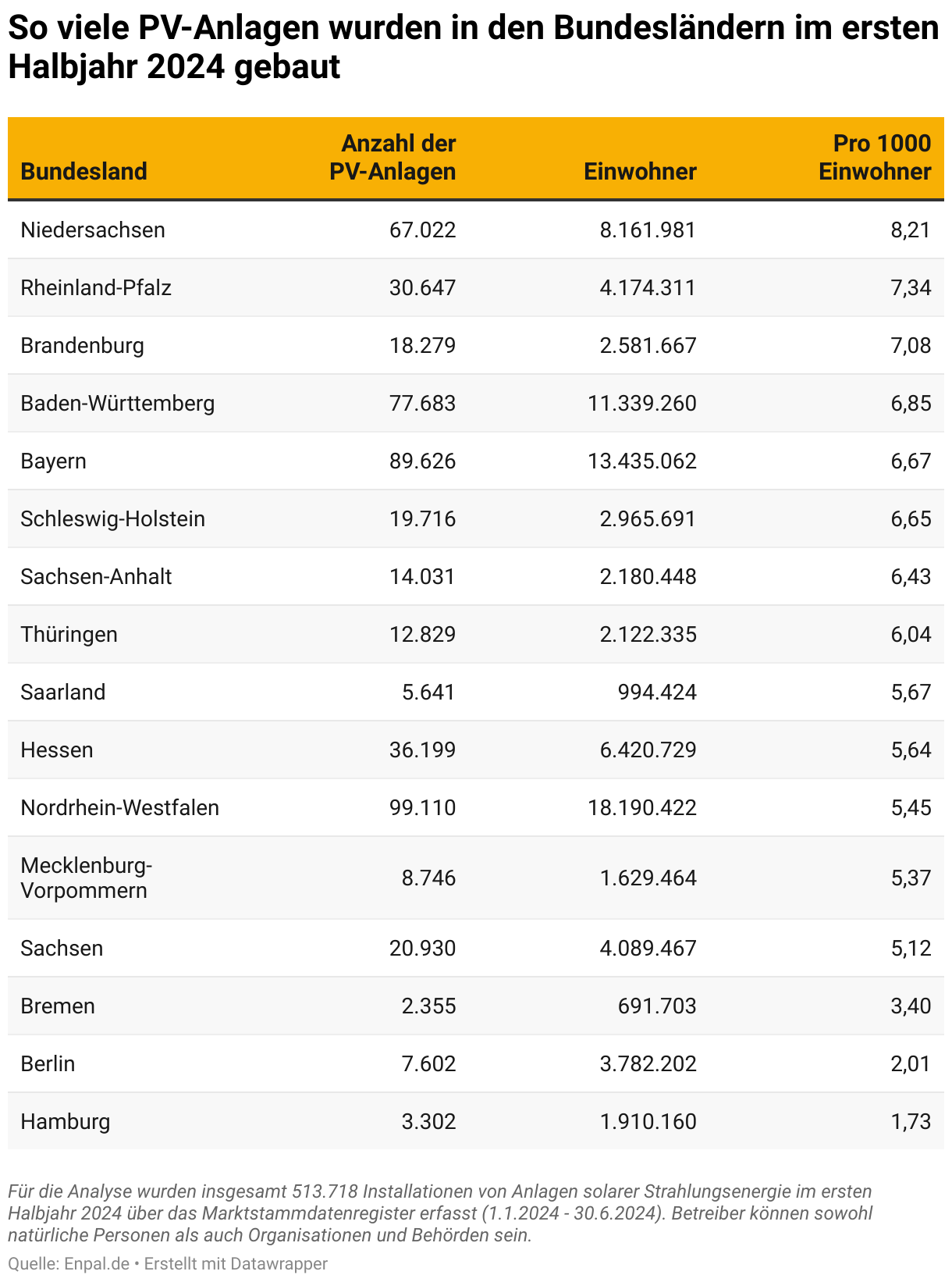 Doch nur weil in einem Bundesland die meisten PV-Anlagen gebaut wurden, heißt das nicht, dass der Ausbau dort am stärksten beschleunigt wurde. Bei der Ausbaugeschwindigkeit steht Bremen mit rund 133 Prozent an der Spitze. Auf dem zweiten Platz steht Schleswig-Holstein (ca. 114 Prozent), dicht gefolgt von Sachsen mit ungefähr 113 Prozent Zubau. Hamburg und Berlin vervollständigen die Top-Fünf mit jeweils ca. 108 Prozent.
