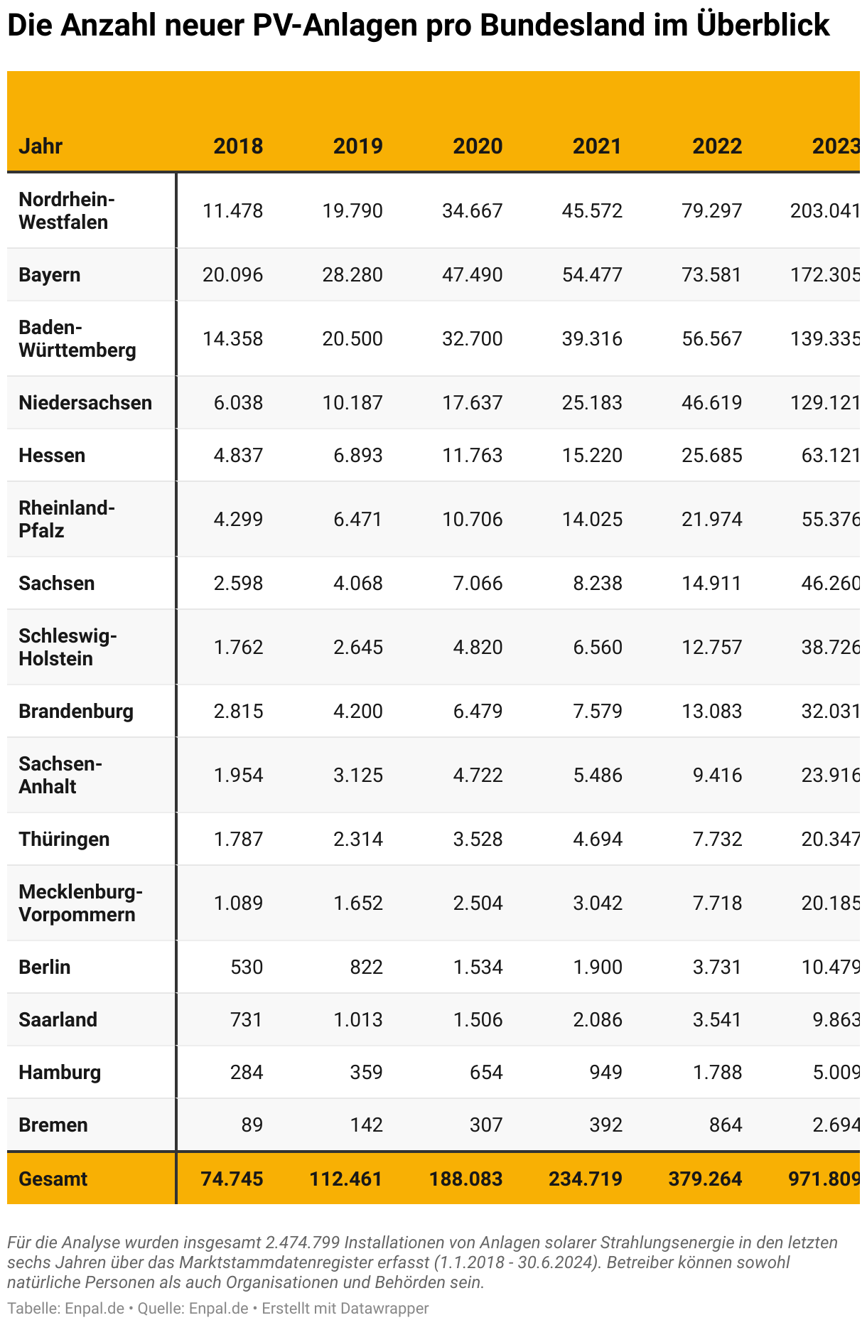 Schaut man sich die Anzahl der gebauten Photovoltaikanlagen an, sieht man schnell, dass auch in 2023 in Nordrhein-Westfalen , Bayern und Baden-Württemberg mit Abstand die meisten PV-Anlagen gebaut wurden. Gesamtüberblick der gebauten PV-Anlagen pro Jahr pro Bundesland finden Sie hier: